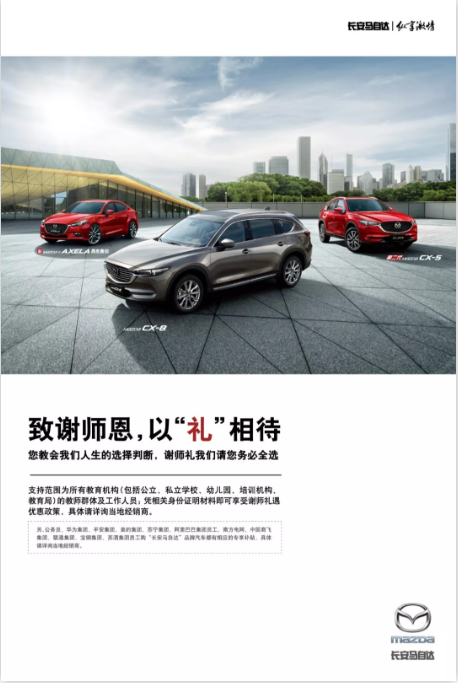 *以上具體優(yōu)惠請詳詢當?shù)亟?jīng)銷商動,以實際行動表達對靈魂工程師的感恩之情。從7月1日到9月30日,教師攜帶相關職業(yè)身份證明至長安馬自達購買相關車型即可享受教師員工專屬優(yōu)惠。